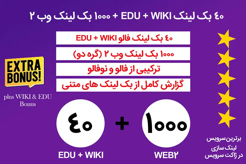 با این سرویس ویژه، ۴۰ بکلینک فالو و متنی از سایتهای معتبر WIKI و EDU با دامین آتوریتی بالا به صورت کاملاً دستی دریافت میکنید.